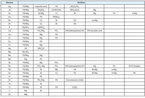 عملکرد مودیفایرها در نمونههای با ماتریس پیچیده نیازمند بررسی دقیق است. دماهای خاکسترگیری و اتمیزاسیون نقش مهمی در بهینهسازی کارایی دارند.در اینجا نمونههایی از مودیفایرهای رایج در GFAAS را نشان داده شده است.