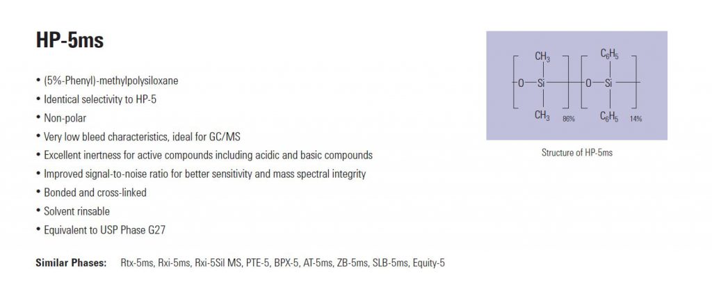 The column has excellent inertness for active compounds, including acidic and basic compounds, and improved signal-to-noise ratio for better sensitivity and mass spectral integrity. HP-5ms is also solvent-rinsable because it is bonded and cross-linked. HP-5ms is equivalent to USP phase G27 and delivers excellent performance across a range of applications.